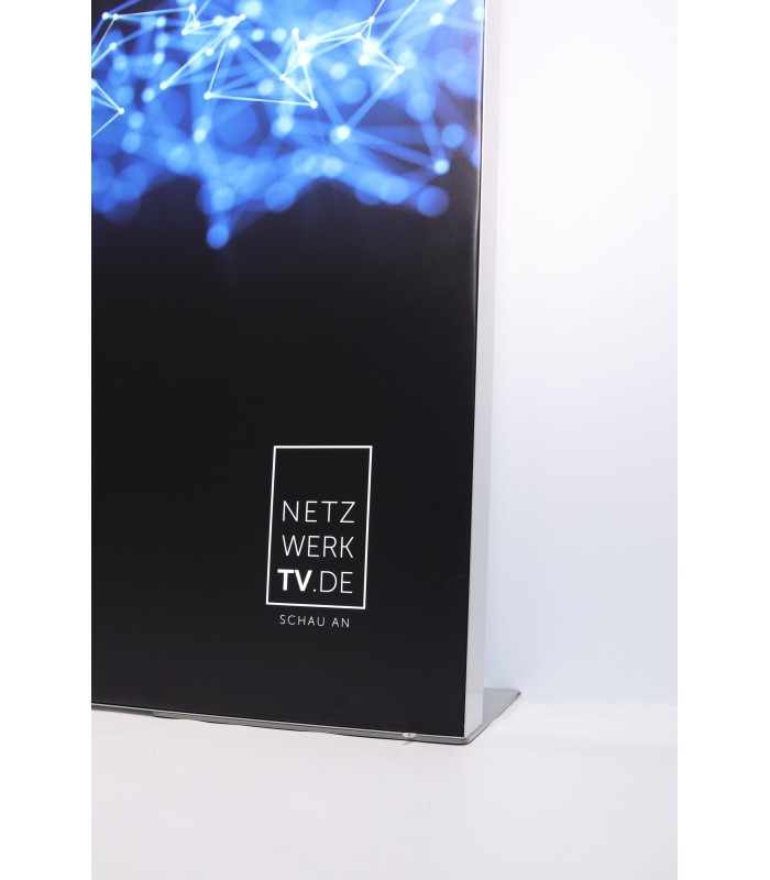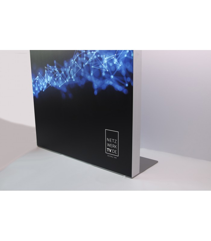 Stellwand freistehend aus Aluprofilen eloxiert // beidseitig bespannt und bedruckt // beidseitige LED-Hinterleuchtung wählbar