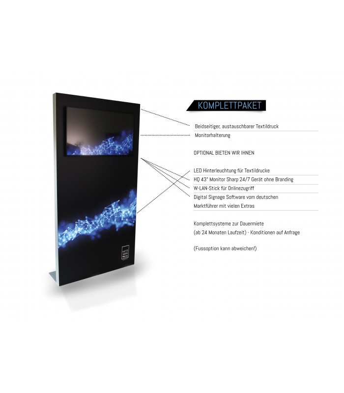 Stellwand gerade // INDOOR // beidseitig bedruckt // Gummilippe // 100 mm oder 120 mm Aluprofile // mit oder ohne Hinterleuchtung // Druckmedium: Blockstoff oder Samba Backlit // mit Monitorhalterung // Standardgrößen // Hier online kalkulieren.