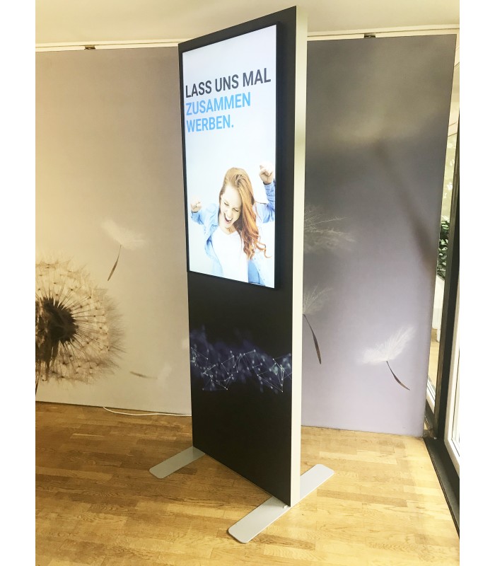 Stellwand freistehend aus Aluprofilen eloxiert // beidseitig bespannt und bedruckt // beidseitige LED-Hinterleuchtung wählbar