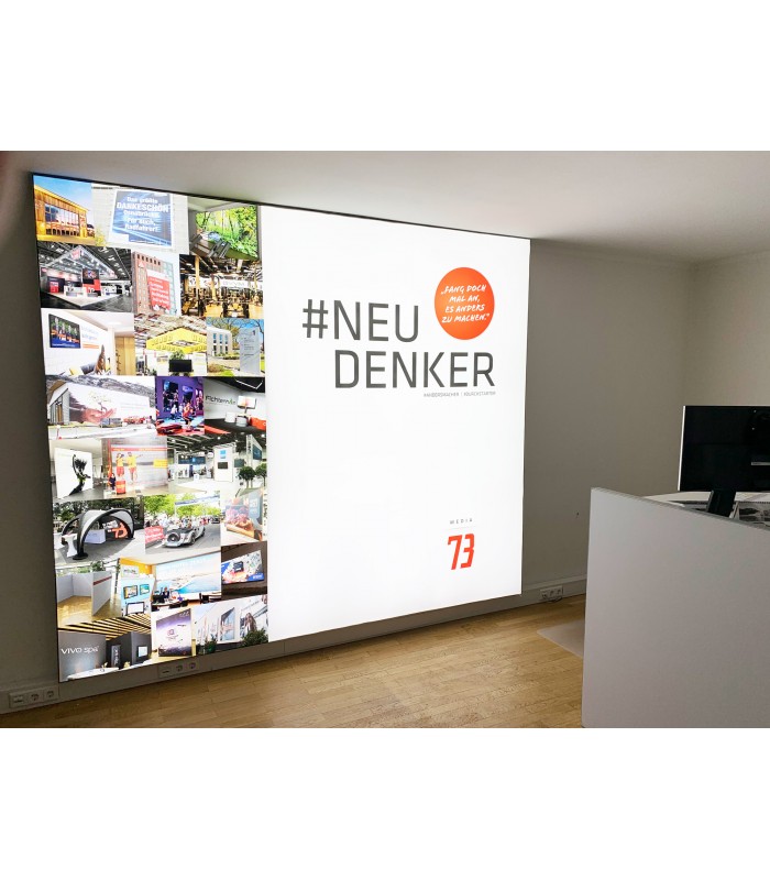 Der Print wird mit einer Gummilippe in den Rahmen eingeschoben.Wandbilder von kleinerer Größe bis hinzu XXL Formaten, zum Beispiel 500 cm x 200 cm lassen sich problemlos realisieren. Per Seiteneinstrahlung erreichen wir bei hellen Motiven bis zu einer Druckbreite von 200 cm eine homogene Ausleuchtung.Bei größeren Druckbreiten empfehlen wir unseren Rahmen mit Flächen LEDs. Formate bei denen die kurzen Strecken über 200 cm lang sein sollen, fragen Sie diese bitte individuell bei uns an - wir unterbreiten Ihnen gerne ein kostengünstiges Angebot. Die Profile werden über Eckverbinder miteinander verbunden. Die LEDs sind bereits an den Profilen vormontiert. Bei größeren Formaten wird eine zusätzliche Strebe eingesetzt. Um einen rückseitigen Lichtaustrittzu vermeiden, wird wandseitig ein weißer Blockstoff mit Gummilippe eingesetzt. Nach der Montage des Rahmens mit Wandhalterungen kann der Backlitstoff eingesetzt werden. Ein Motivwechsel ist unkompliziert und kostengünstig.