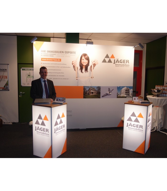 Diese gerade, einseitige bedruckte Stellwand ist beliebig einsetzbar. Individuelle Formate möglich (ab 2 m²), HQ-Druck auf dehnbarem Blockstoff (B1 zertifiziert) mit Gummilippe. Dadurch besonders einfache Handhabung. Printwechsel einfach und kostengünstig.