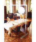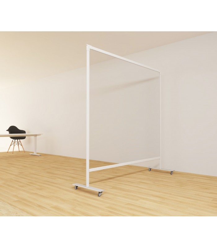 Umlaufender Rahmen aus 45 mm breiten Aluprofilen (eloxiert), vollflächig bestückt mit einer transparenten Acrylscheibe, 5 mm stark. 2 flache pulverbeschichtete Stahlfüße im Format 80 cm x 14 cm sorgen für einen sicheren Stand. Optional liefern wir die Füße mit feststellbaren Lenkrollen. Die Lieferzeit beträgt derzeit ca. 8 Werktage.